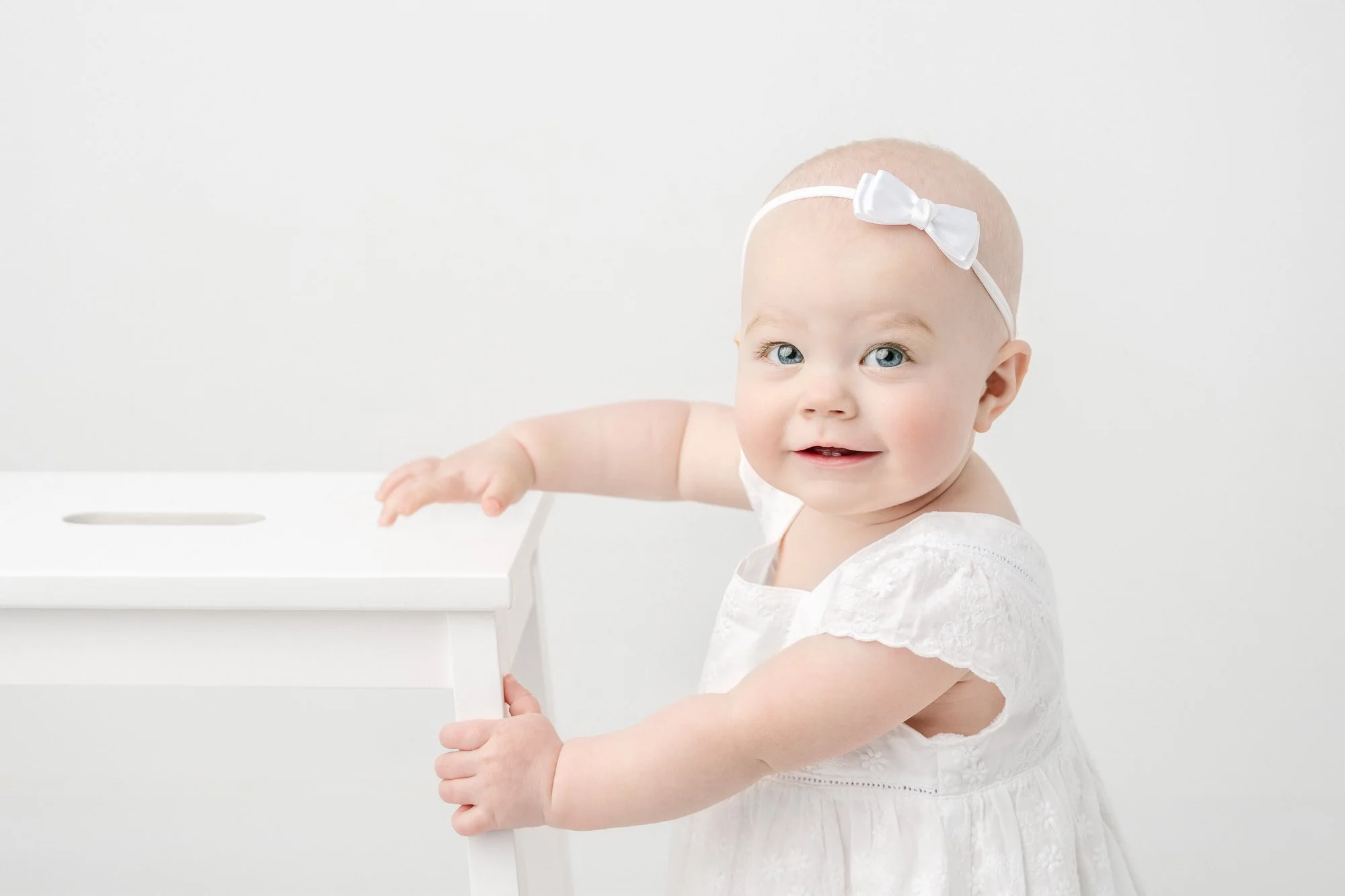 Solo portraits of your one-year-old in the studio wardrobe or a special outfit, a onesie or t-shirt, and/or just a diaper