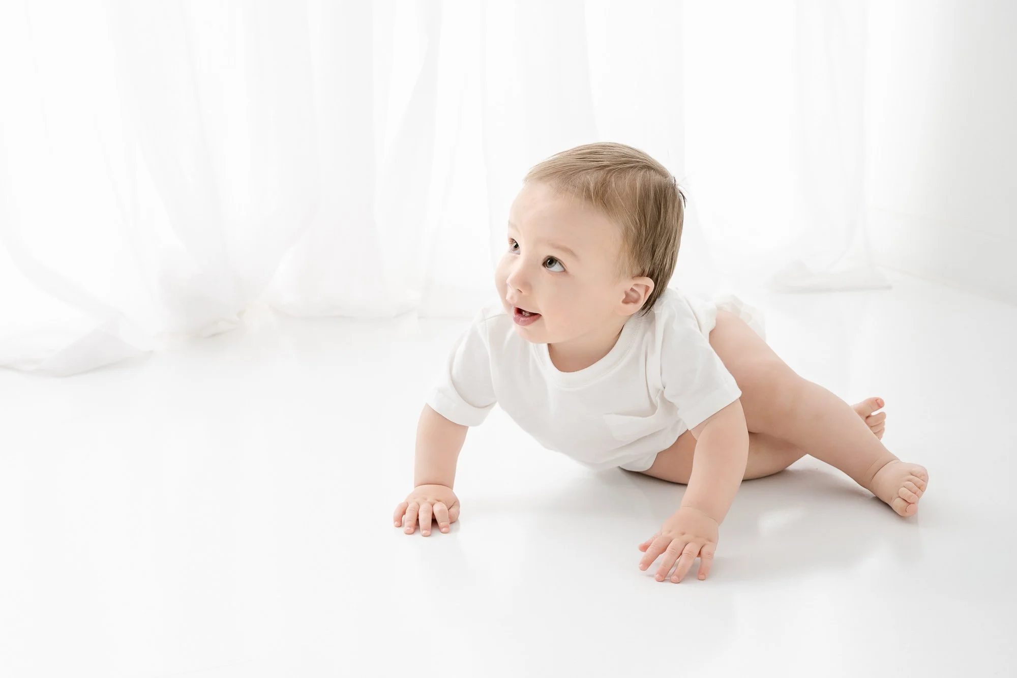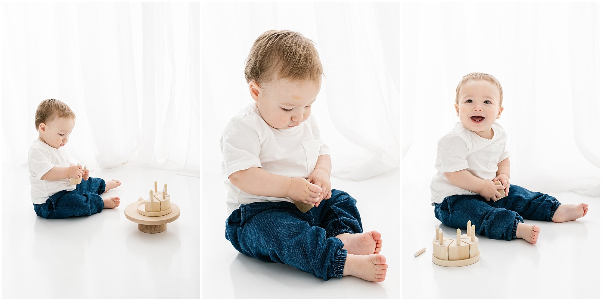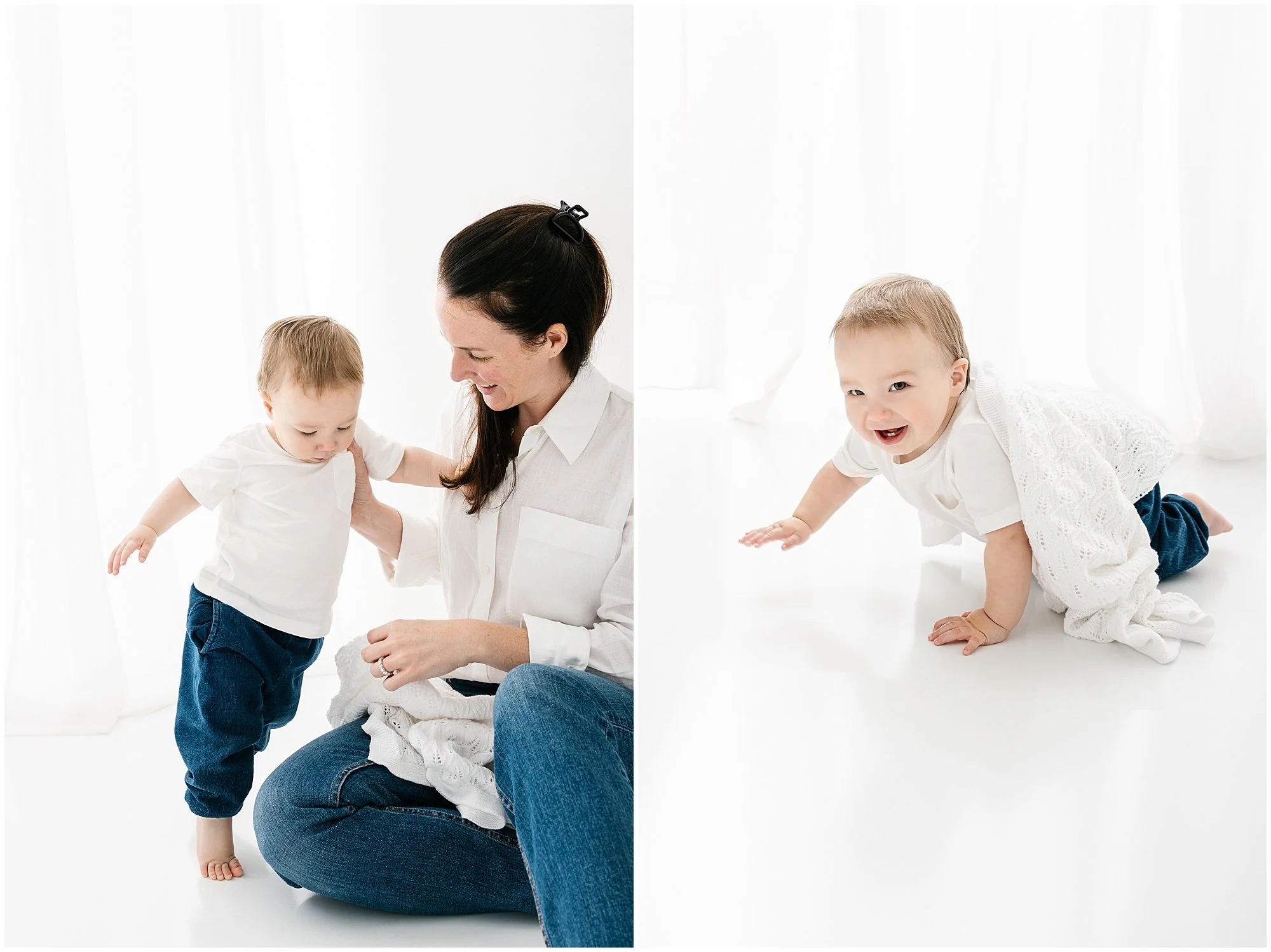 We began with a soft white t-shirt from the studio wardrobe and a simple diaper — allowing his soulful eyes, sweet expressions, and those irresistibly dimpled legs to take center stage. One year old babies are wonderfully animated. Their personalities are emerging, their independence is growing, and every expression feels fleeting.