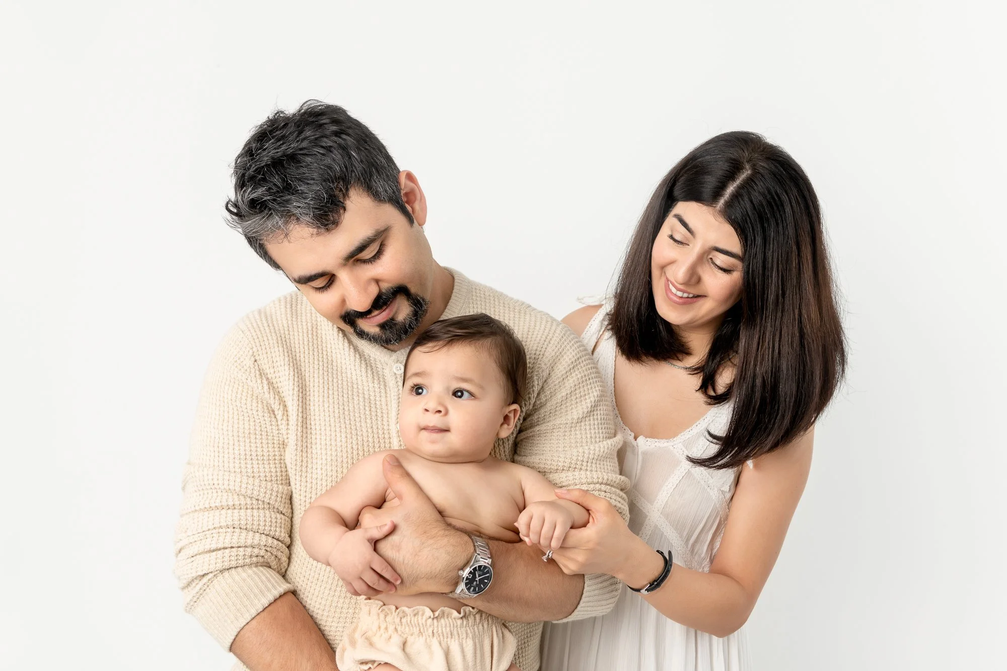 We used our white, minimalist baby photography studio, which was perfect for creating classic portraits that will look beautiful on the walls of any home. Mom and dad were in the process of building their dream home in New Jersey and knew they wanted to begin a gallery wall with all their favorite family memories, so a clean, white background for photos ensured timeless images that will look beautiful on the walls of their new home.