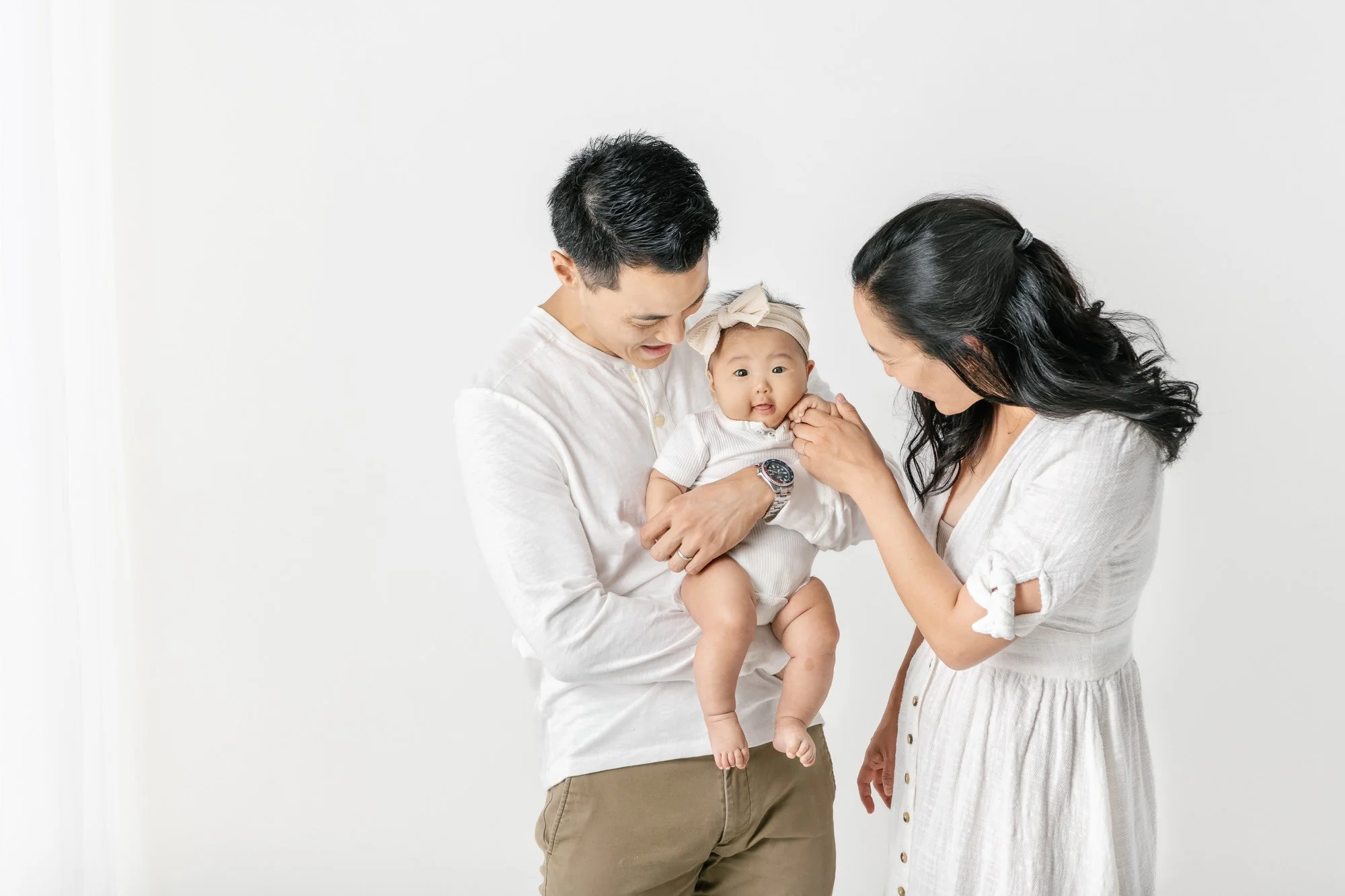 I chose outfits for the whole family from my studio wardrobe. She wanted a clean, white, neutral look to their clothing. Their photos from four years ago were hanging on the walls of their new home, and she wanted to make sure that the new work would feel cohesive with the old. Because we did all of our planning via Zoom, I made a few videos showing the different options for each member of the family. Mom liked all of the options, so I picked out my favorites and had them steamed and ready for when the family arrived.