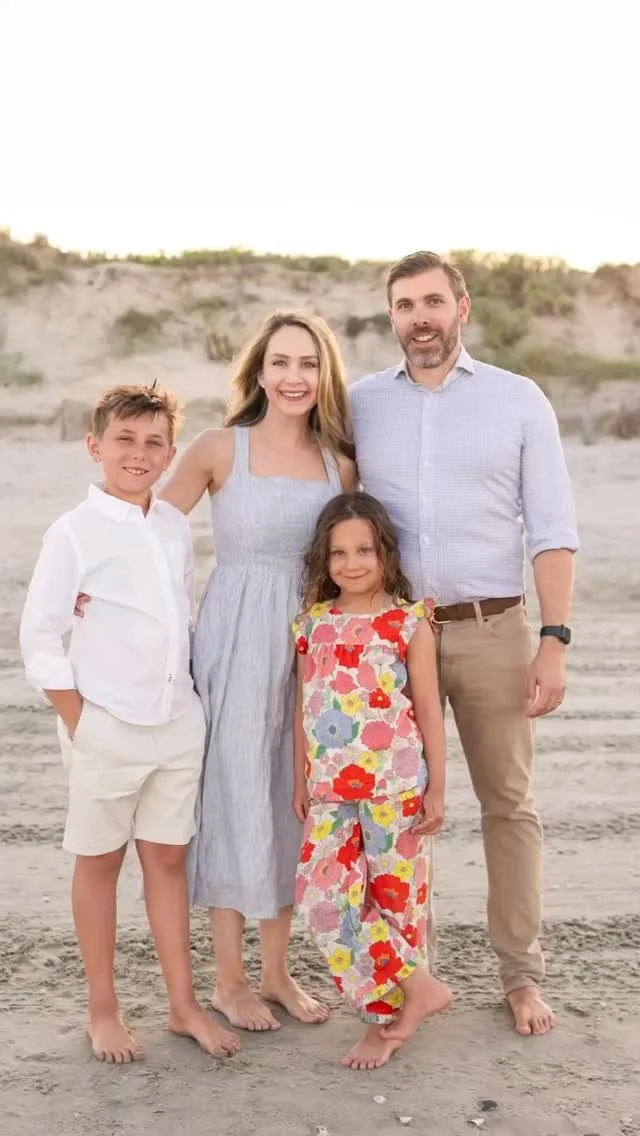 Bright and playful studio portrait of family of four to celebrate mom’s maternity session.